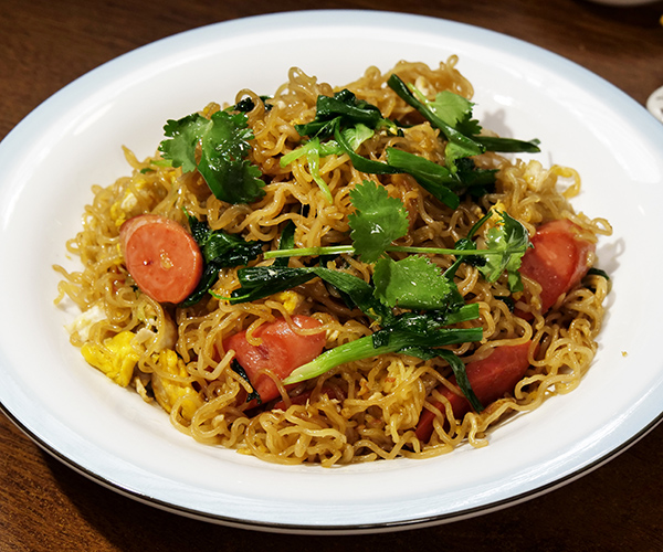 3鍋中倒入少許油放入雞蛋、火腿腸炒均勻后,加入小蔥,香菜,安記炒粉炒面調料,生抽一起翻炒3分鐘左右即可。